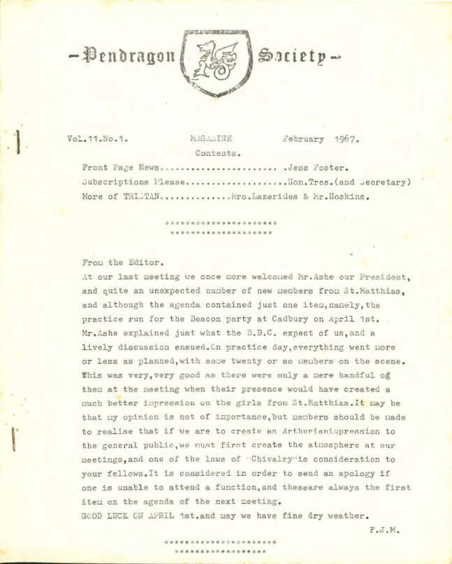 The Pendragon Society was founded in October 1959 by Jess Foster (Secretary) and Geoffrey Ashe (Chairman) with the aim to: