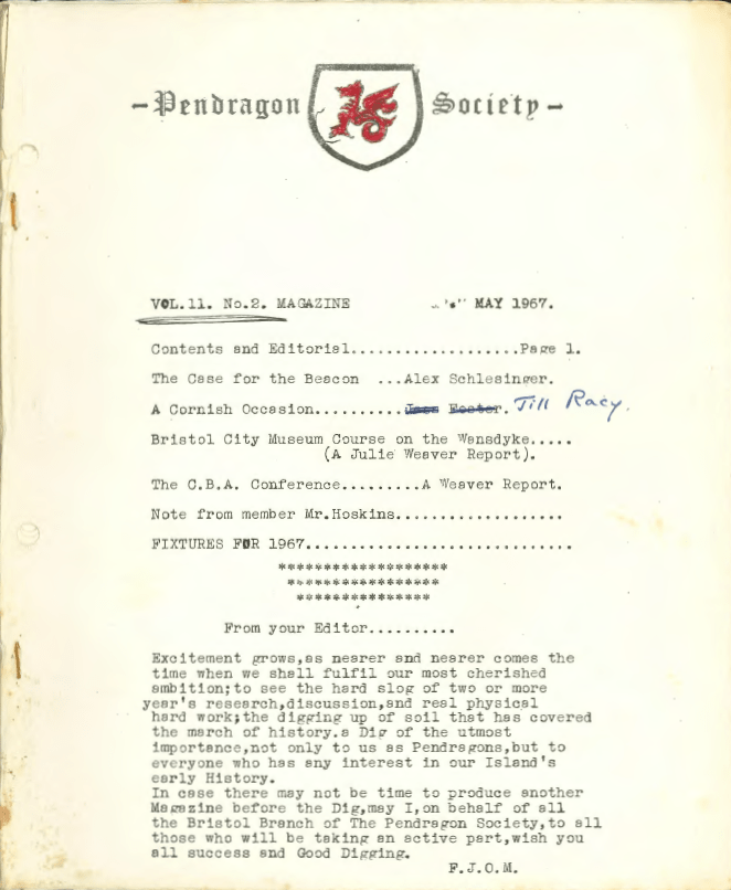 As the 1970s progressed, the journal expanded its focus, engaging with the then-popular “earth mysteries” movement while continuing to explore Arthurian themes. In 1977, Chris Lovegrove—who had volunteered at Cadbury—took over as editor. Although the mantle of editor was also taken over for periods by Kate Pollard (daughter of Jess Foster), Eddie Took, Charles Evans-Gunther and others, Lovegrove continued in the role until the Society’s closure in 2009, its aim to ‘stimulate interest in King Arthur’ fulfilled.